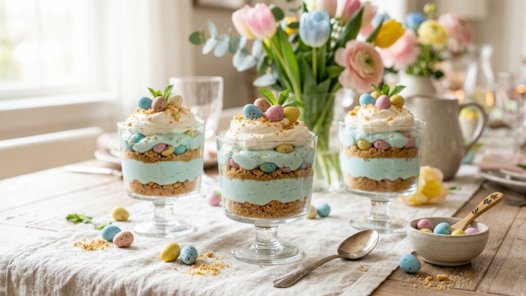 If you need an easy Easter dessert that looks festive without turning into a major baking project, these Robin’s Egg No-Bake Cheesecake Parfaits are a great choice. They’re creamy, sweet, colorful, and layered with a soft cheesecake filling, crushed cookies, and candy-coated chocolate eggs for a dessert that feels cheerful and fun on the table.